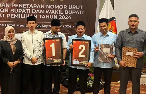 Komisi Pemilihan Independen (KIP) Aceh Barat resmi menetapkan pasangan calon bupati dan calon wakil bupati Aceh Barat antara pasangan Tarsa dan Hakam-Ayi. Senin (23/9/2024) Penetapan nomor urut Pilbub berlangsung dalam rapat pleno terbuka di Parkside Meuligoe Hotel Meulaboh, Senin (23/9/2024).